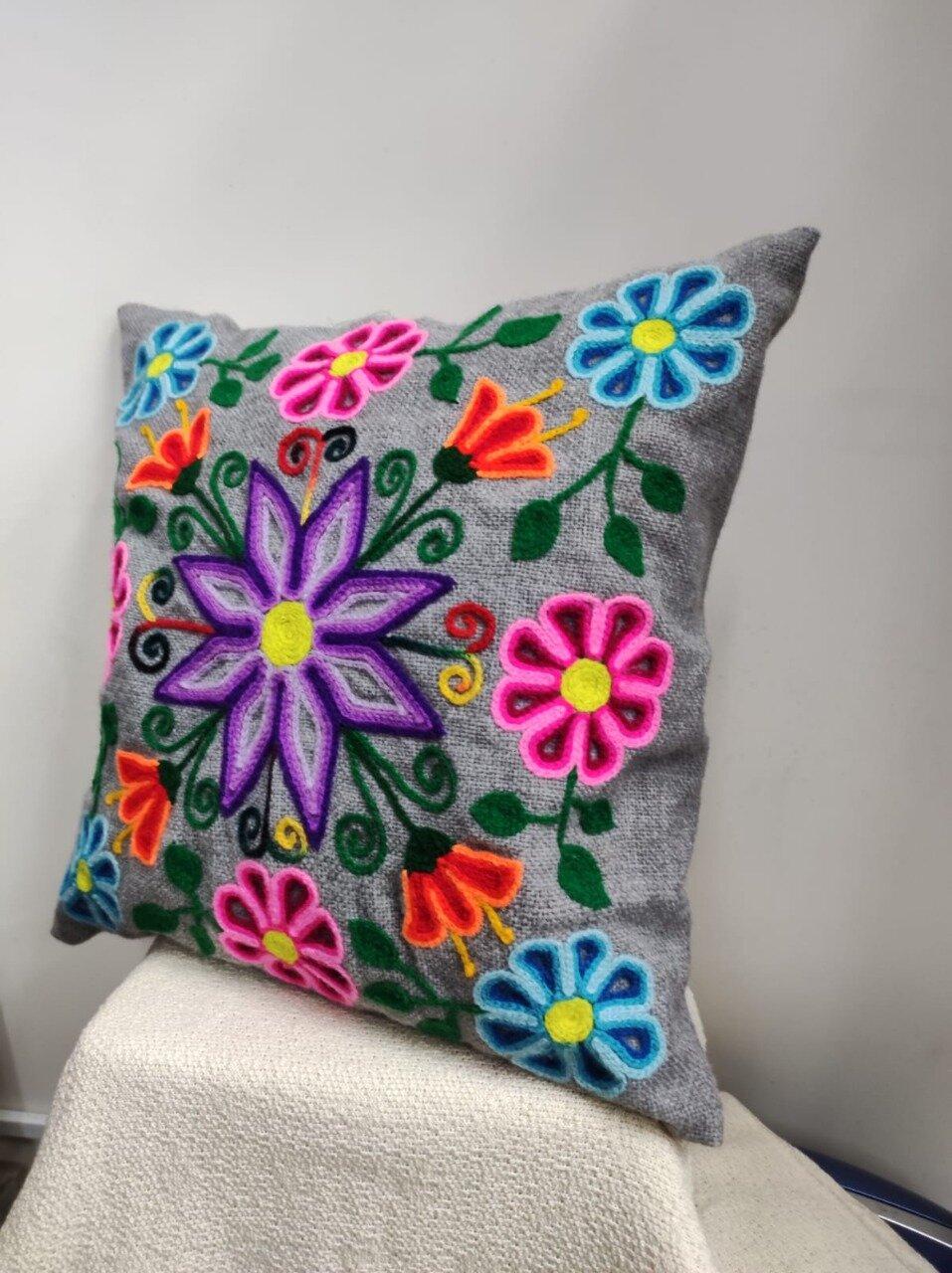 Hermosas fundas diseñadas y bordadas a mano sobre tejido de alpaca. En medida 45x45. Disponible en cuatro unicos colores